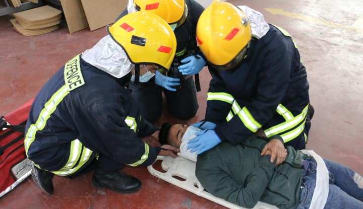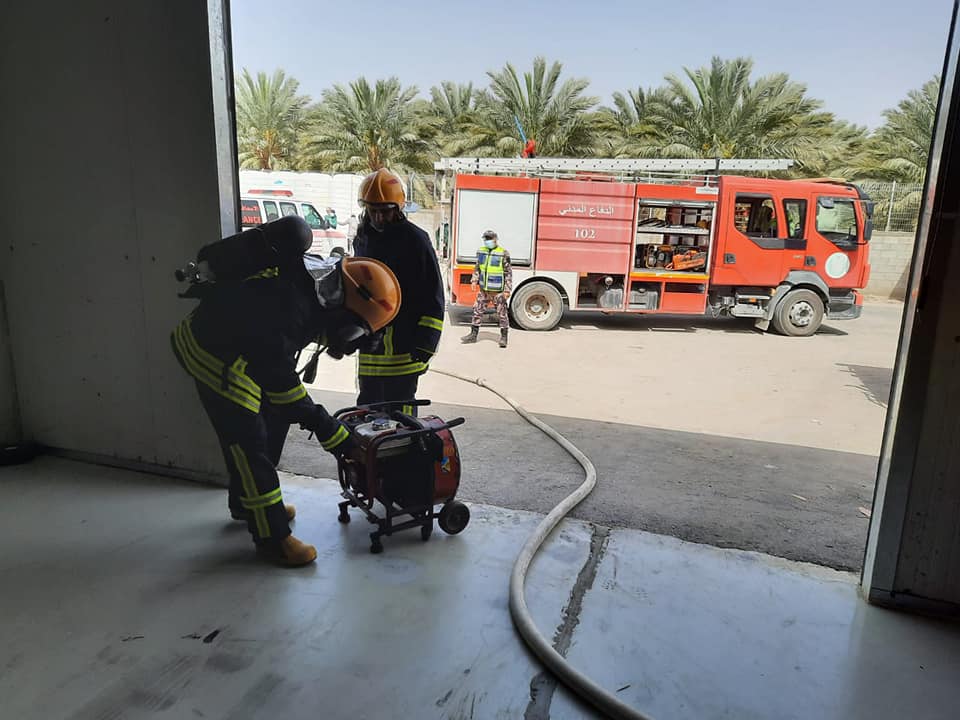 شملت محاكاة لعمليات اخلاء لموظفين ناتج عن حدوث حدث طارئ داخل المبنى استدعى تشغيل جهاز الانذار المبكر والذي عمل على استدعاء طواقم الاطفاء والانقاذ للموقع ، وعند دخول وتفقد الطواقم للمبنى تبين وجود حالة اغماء لاحد العاملين وتم اخلاؤه وتسليمه لسيارة اسعاف الخدمات الطبية العسكرية ، وقامت الطواقم بتهوية الموقع والتأكد من عدم وجود اي تسرب غاز .