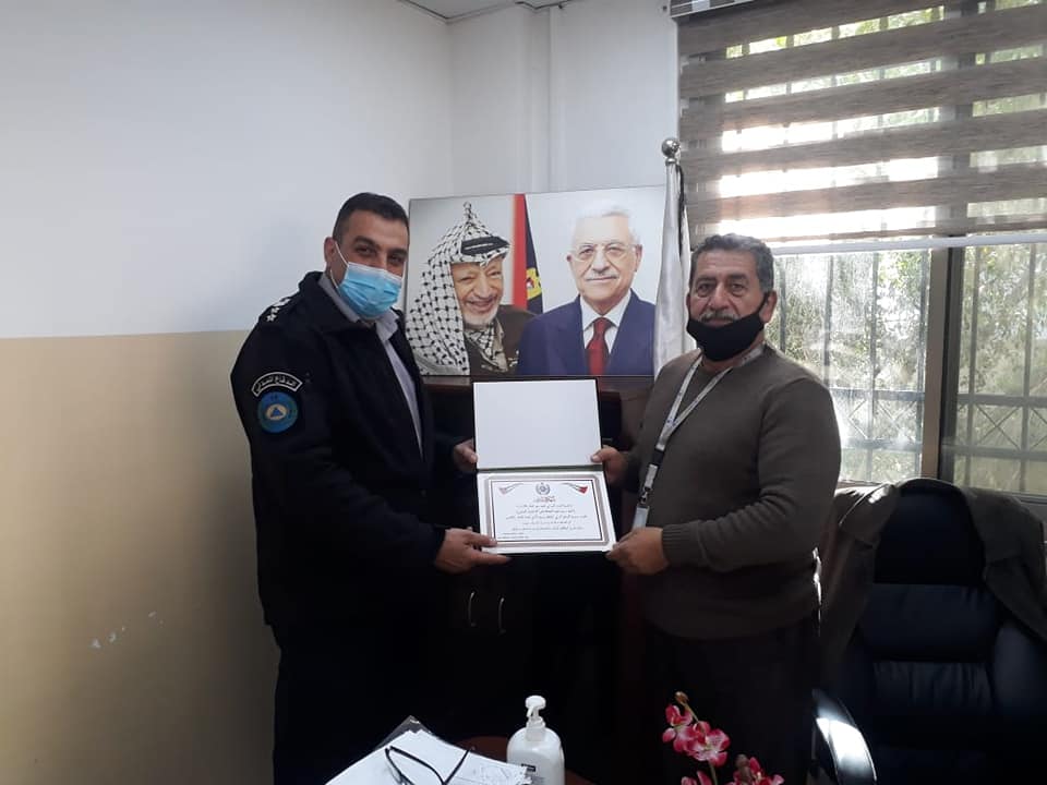 وقدم مدير الدفاع المدني في محافظة جنين العقيد عماد ابو ذياب شهادات تقدير لرئيس بلدية جنين السيد فايز السعدي وبحضور رئيس الغرفة التجارية في جنين الاستاذ عمار ابو بكر كما تم تكريم رئيس شركة توزيع كهرباء الشمال في جنين السيد ناصر ابو عزيز ومدير الاشغال العامة في جنين السيد جهاد زكارنه تكريماً لهم على دورهم في مساندة و دعم الدفاع المدني .