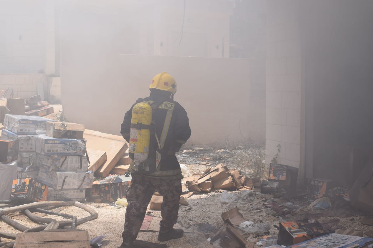 إخماد حريق مخزن أعلاف وممتلكات في بلدة دار صلاح شرق بيت لحم .