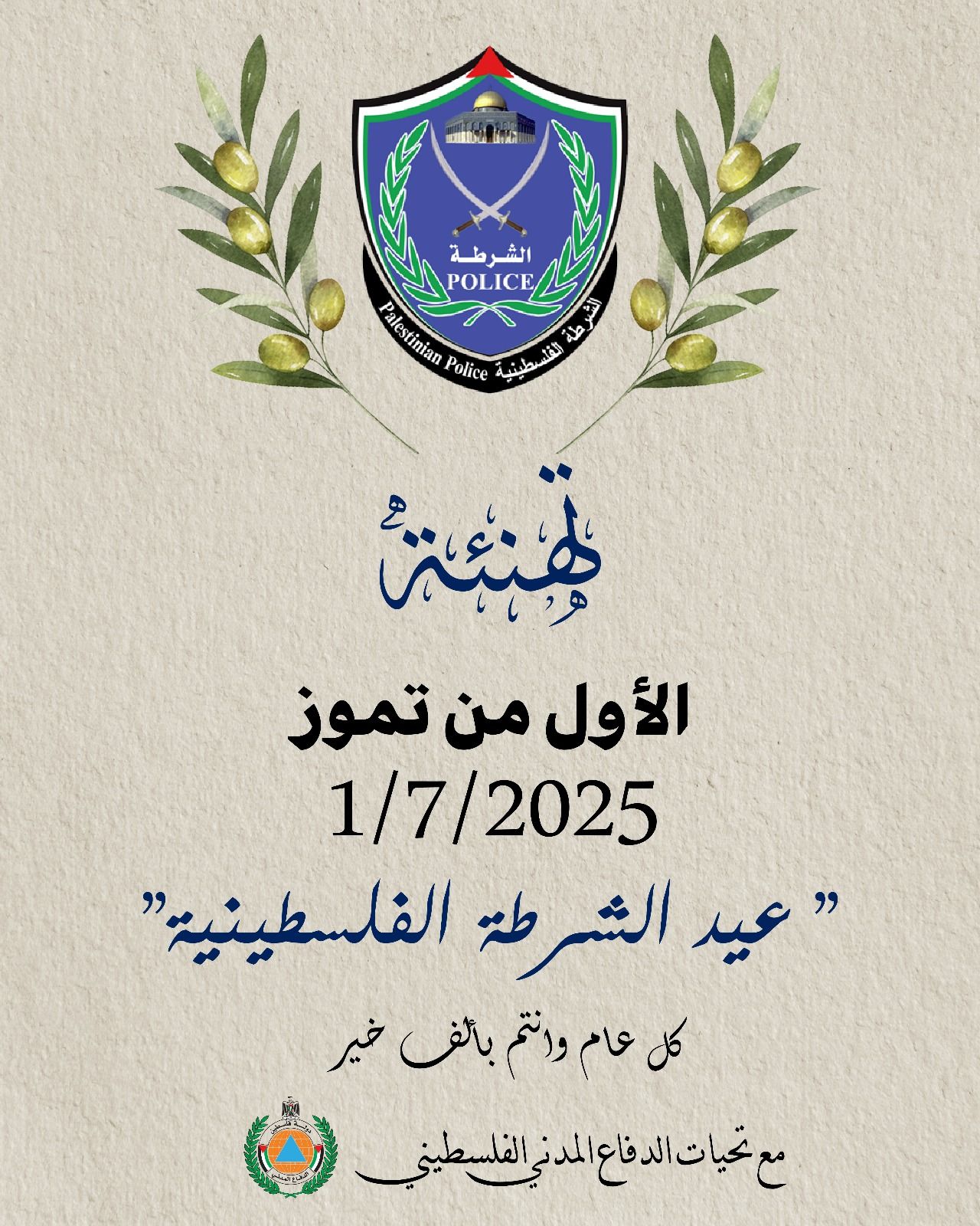 أبرق مدير عام الدفاع المدني اللواء ركن أكرم ثوابتة برقية تهنئة وتبريك بالعيد 31 للشرطة الفلسطينية جاء فيها :