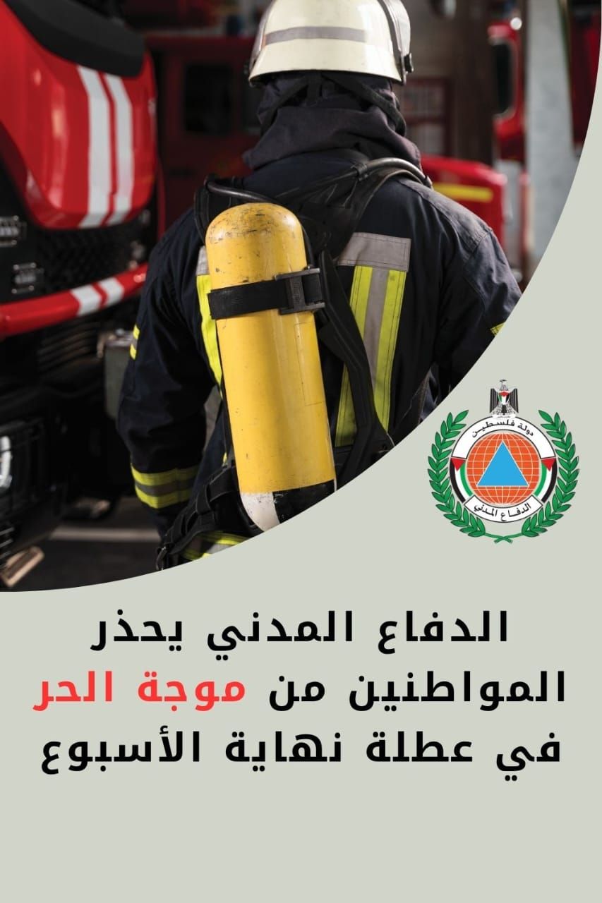 حذّر الدفاع المدني المواطنين من موجة الحر بحسب تنبؤات الأرصاد الجوية الفلسطينية بتعرض المنطقة حاليا لموجة حر والتي ستهشد إرتفاع على درجات الحرارة تبدأ من صباح الخميس حتى مساء الأحد .