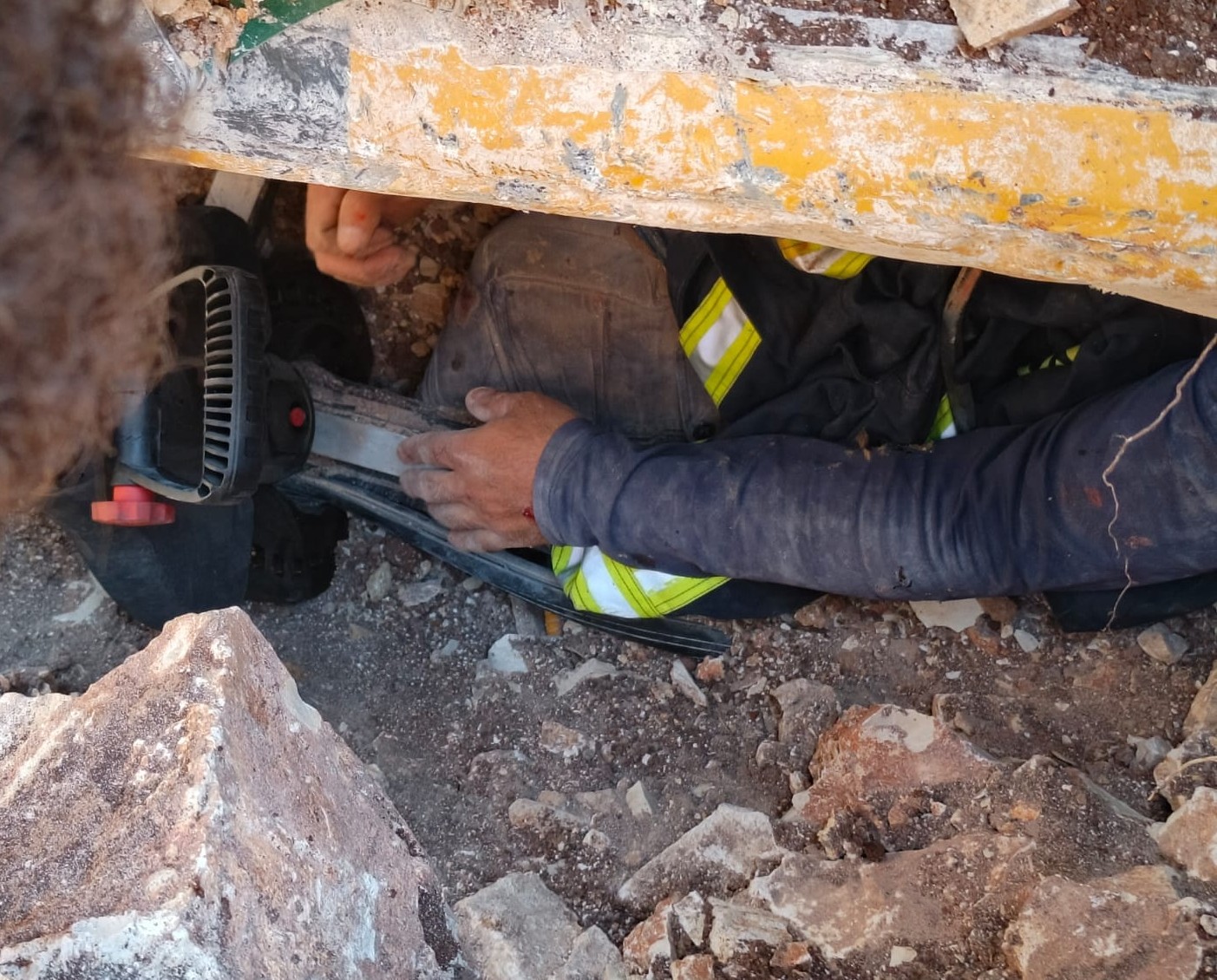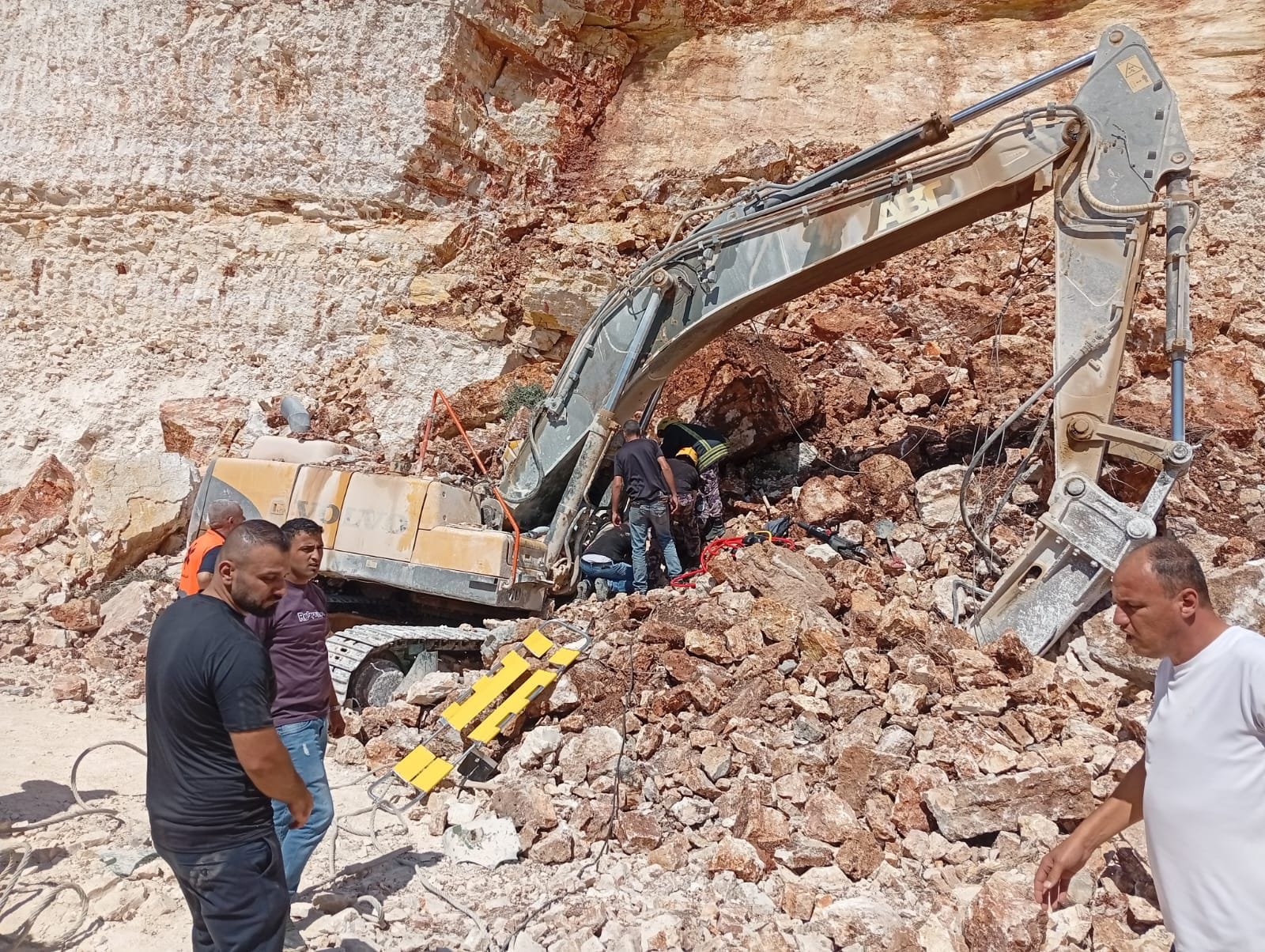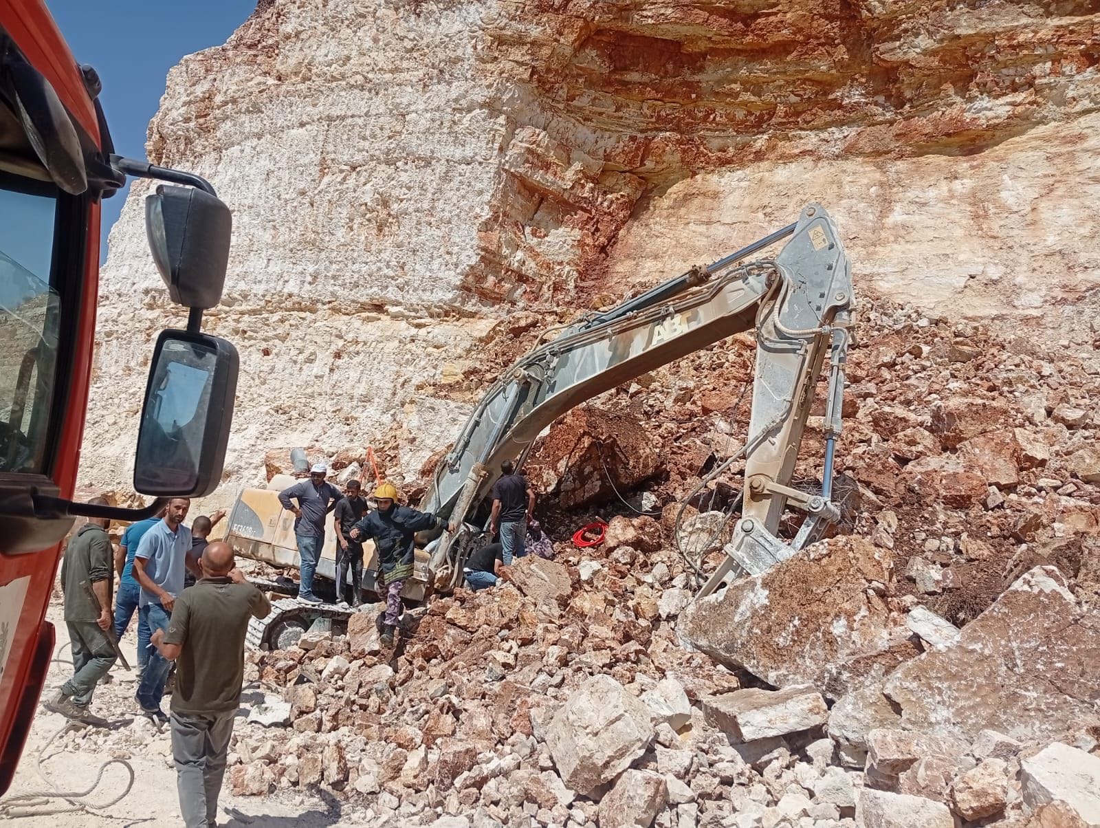 فذكر ضابط الموقع أن انهيار صخور وأتربة على السائق أثناء عمله مما أدى إلى إصابته وإحتجازه داخل الآلة فعمل الطاقم فور وصوله على قص الغرفة وتحرير السائق وتسليمه لطواقم الإسعاف إضافة إلى البحث والتفتيش لإزالة الخطر .
