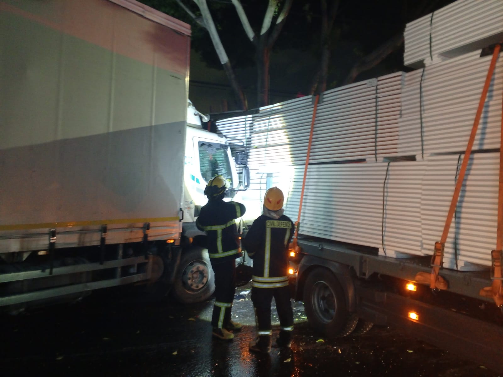 أمنت طواقمنا في مديرية محافظة بيت لحم فجر اليوم الخميس 25/09/2025 ، حادث سير إنزلاق مركبة شحن وإصطدامها بمركبة شحن ثانية في مدينة بيت جالا غرب المحافظة .