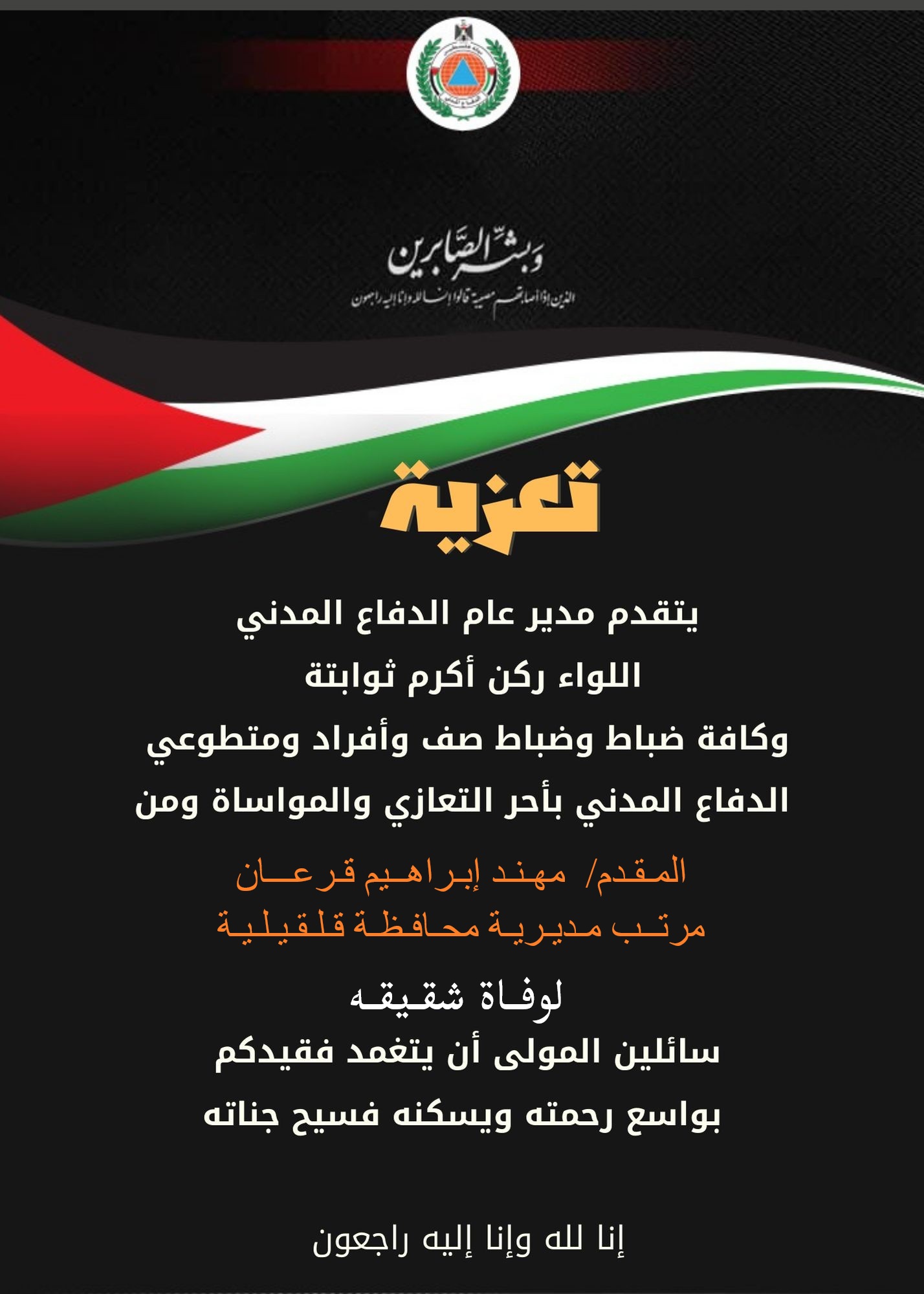 يتقدم مدير عام الدفاع المدني اللواء ركن أكرم ثوابتة وكافة ضباط وضباط صف وأفراد ومتطوعي الدفاع المدني الفلسطيني يتقدمون بأحرّ التعازي والمواساة من