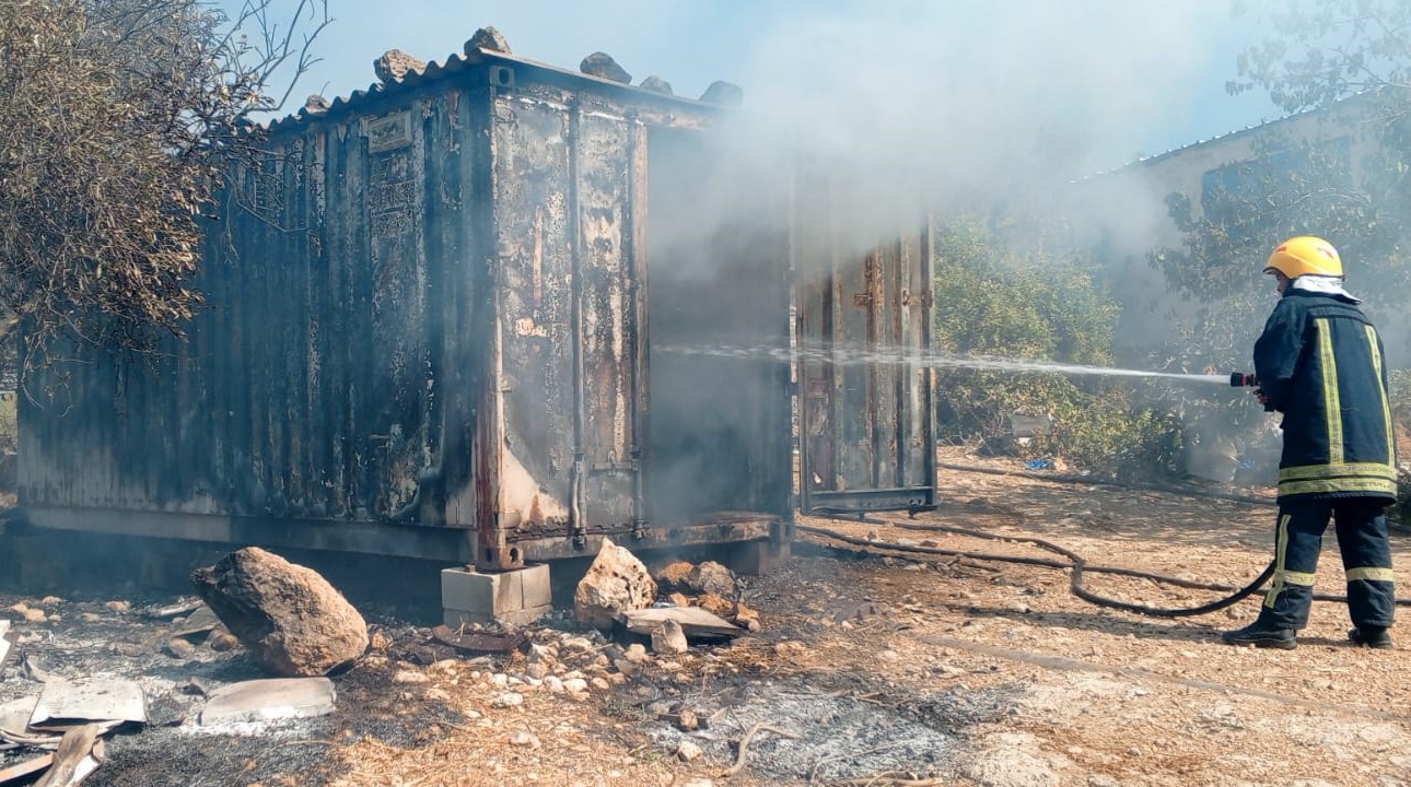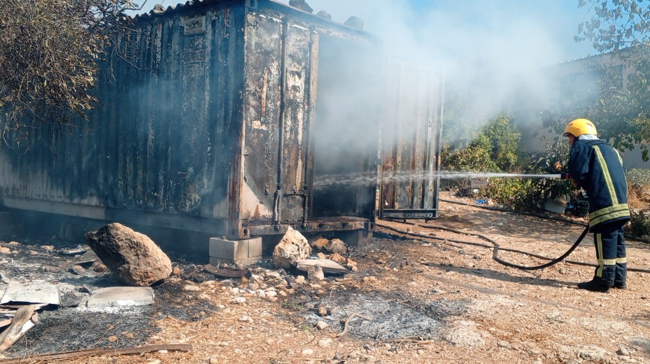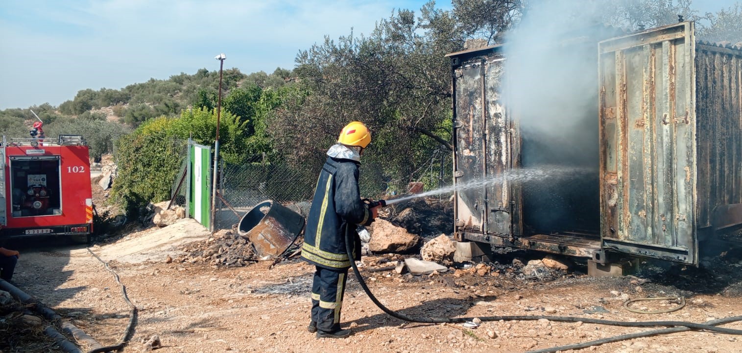 عمل الطاقم على إحماد النيران المشتعلة بكامل محتويات الكونتينر والأدوات والأغراض أمامه من أعشاب وأشجار زيتون والسيطرة عليها ومنع امتدادها إلى الأراض المجاورة .