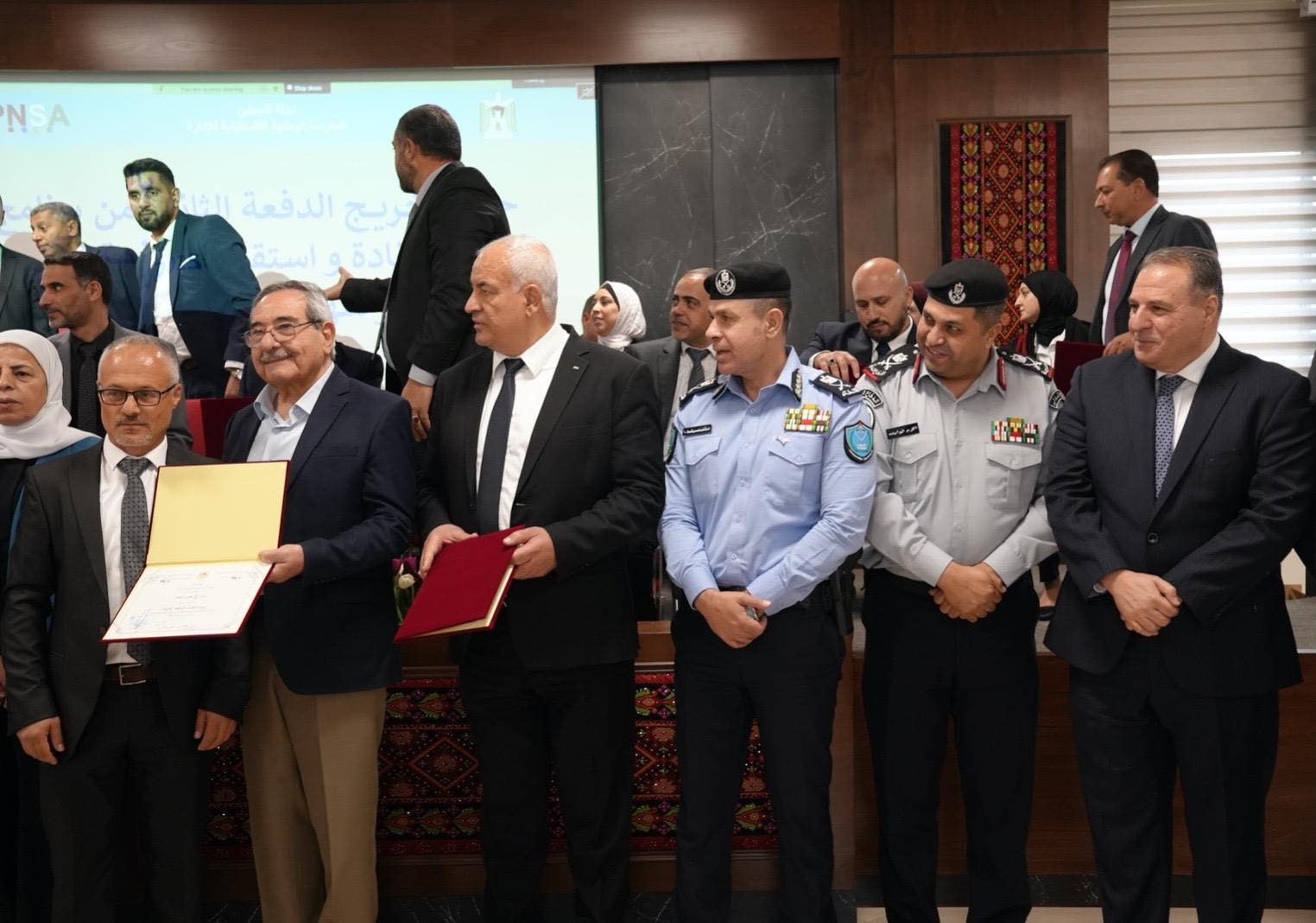 وفي ختام الحفل، جرى تسليم شهادات التخرج لـ(26) قائداً وقائدة من الفوج الثاني، إلى جانب استقبال الدفعة الثالثة التي تضم (29) متدرباً من مختلف القطاعات الوطنية، إيذاناً بانطلاق مرحلة جديدة من الاستثمار في الكفاءات الفلسطينية المؤهلة لقيادة مؤسسات الدولة نحو التميز والفعالية .