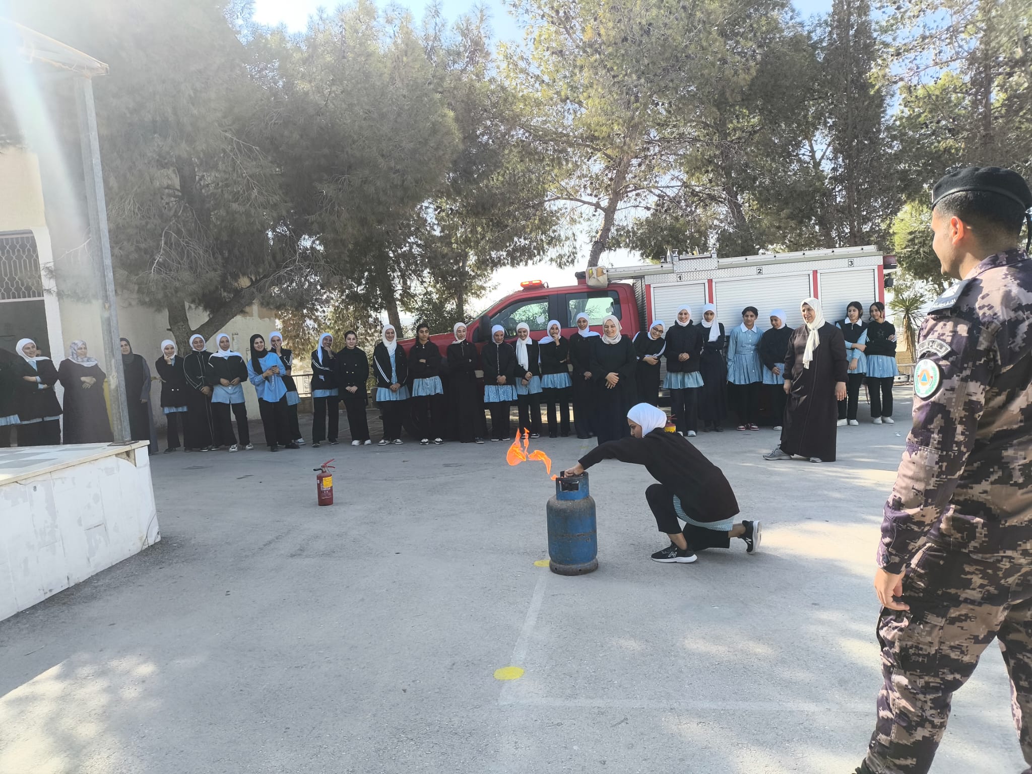 ضم التدريب طالبات المدرسة إضافة لهيئة التدريس وشمل الجوانب النظرية لعلوم الدفاع المدني وما يرافقها من إطفاء وإنقاذ وإخلاء ووقاية والسلامة المنزلية والتصرف السليم والسلوك الصحيح عند التعامل مع الكوارث الطبيعية وتم تعريفهن على مركبة الإطفاء ومحتواها من معدات وأدوات ومعرفة طبيعة عمل كل معدة ، وتعريفهن بلباس رجل الإطفاء والإطلاع والتدريب على اسطوانات الإطفاء اليدوية ومخاطر الغاز المنزلي والكهرباء وكيفية التعامل السليم معها ، وطبيعة عمل رجل الدفاع المدني ومهامه بمكافحة الحرائق وإنقاذ المواطنين باستخدام المعدات المخصصة وإرشادهن لوقاية أنفسهن من مخاطر الحرائق والحوادث .
