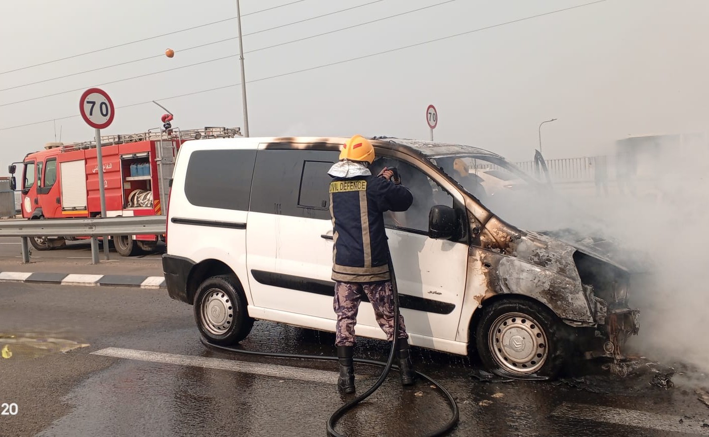 عمل الطاقم على إخماد النيران في المركبة وحصرها بالهيئة الأمامية وأجزاء منها إضافة إلى التبريد على النيران وتفقد المركبة ومحيطها .