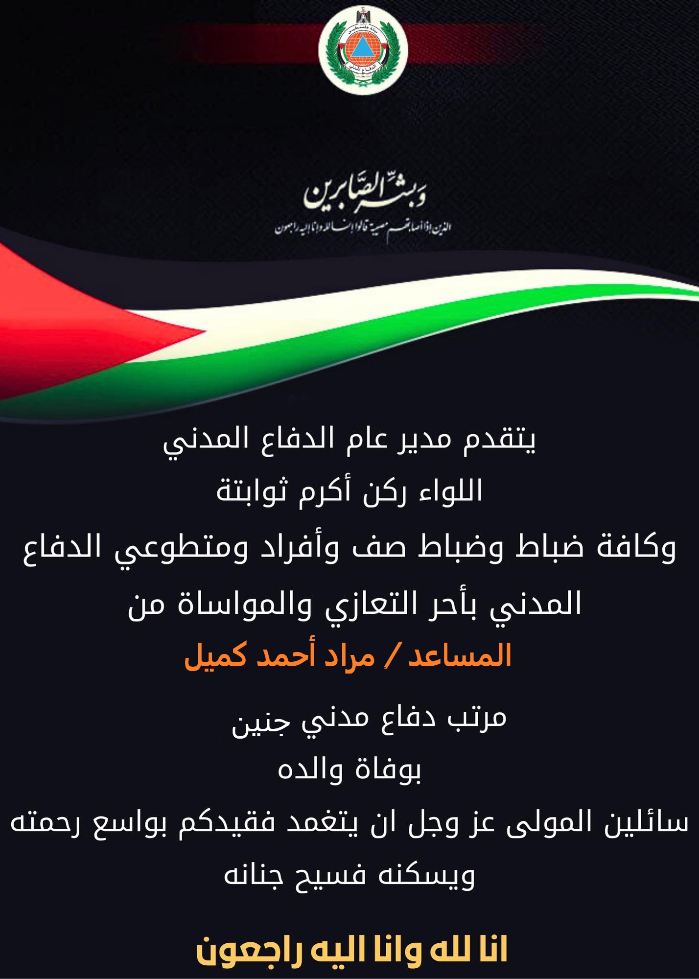 يتقدم مدير عام الدفاع المدني اللواء ركن أكرم ثوابتة وكافة ضباط وضباط صف وأفراد ومتطوعي الدفاع المدني الفلسطيني يتقدمون بأحرّ التعازي والمواساة من