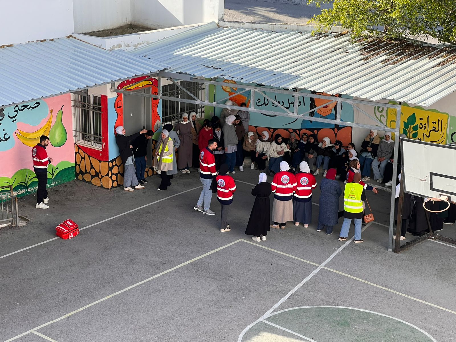 كما ونظمت فرقة المتطوعين تمرين إنقاذ مصاب وتقديم الإسعاف الأولي له امام طالبات المدرسة أظهروا فيه العمل الجماعي والمسؤولية المجتمعية والكفاءة العالية .