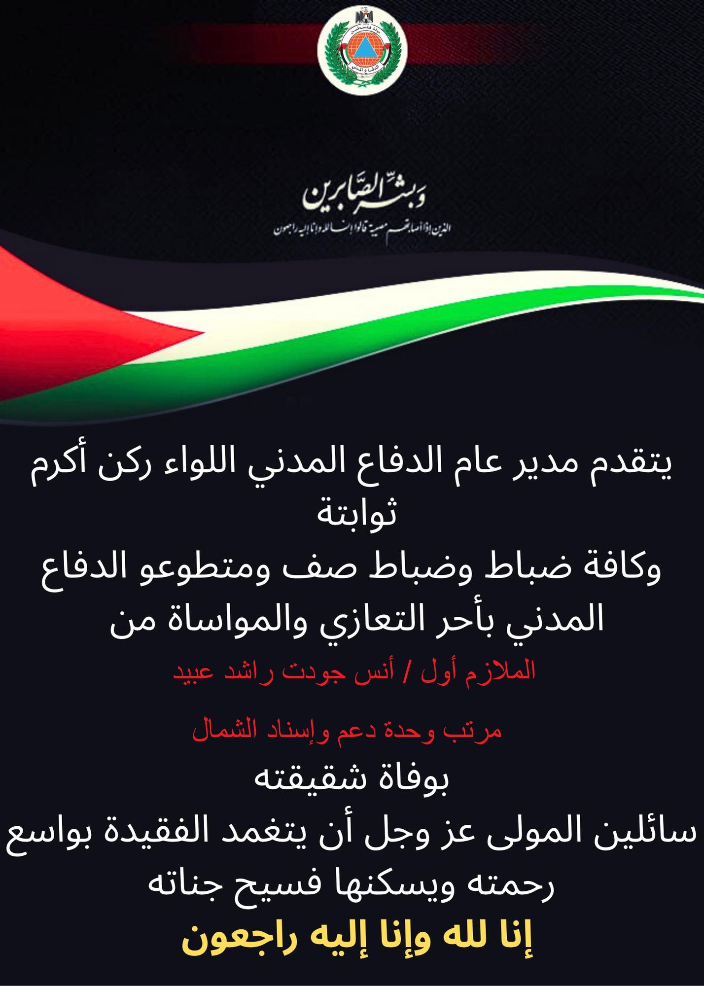 يتقدم مدير عام الدفاع المدني اللواء ركن أكرم ثوابتة وكافة ضباط وضباط صف وأفراد ومتطوعي الدفاع المدني الفلسطيني يتقدمون بأحرّ التعازي والمواساة من