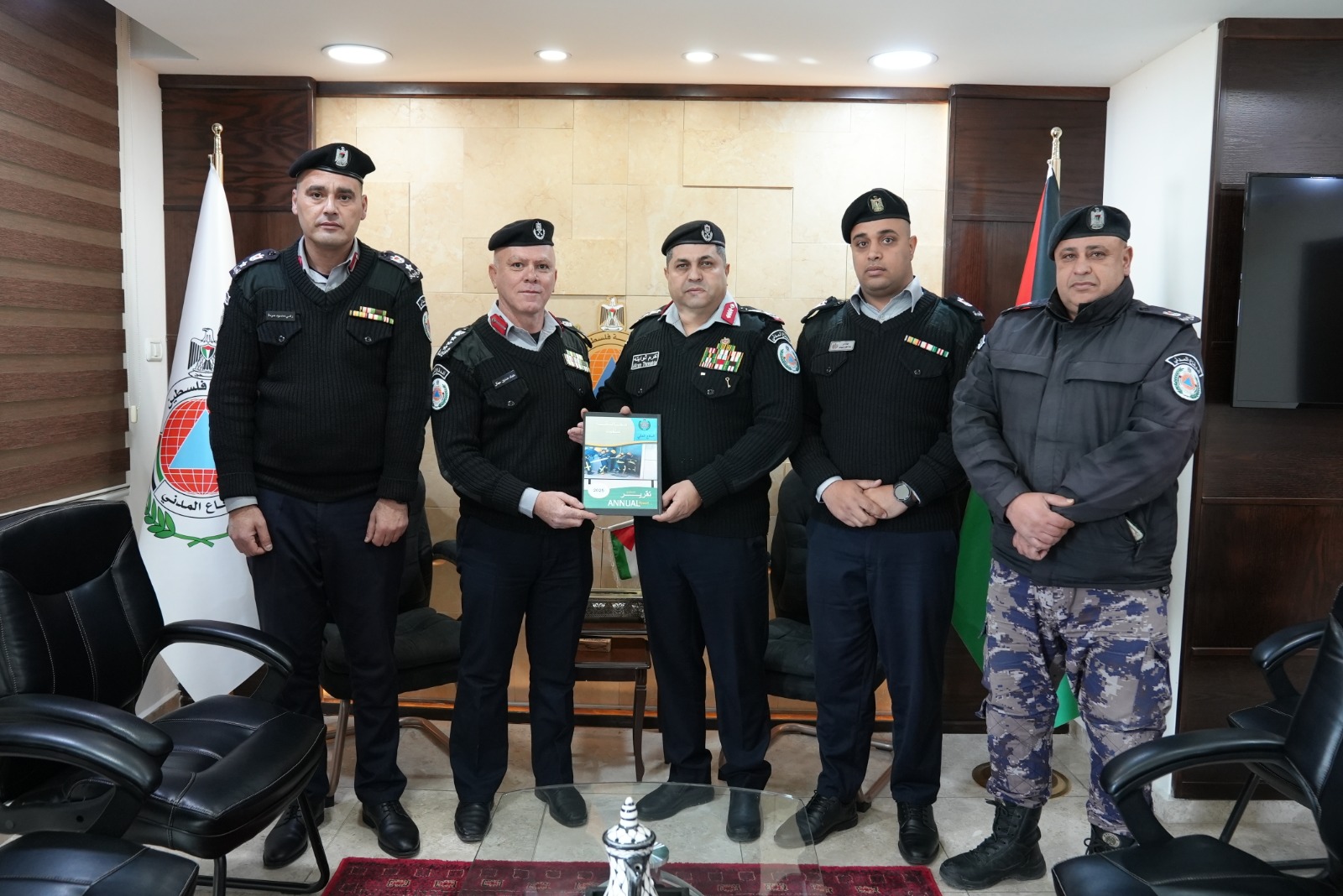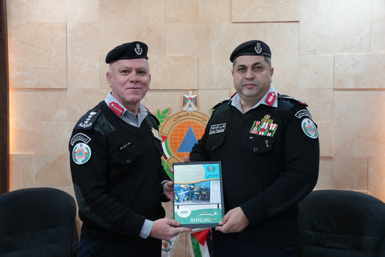 سلّم مدير دفاع مدني محافظة سلفيت العميد عماد الجمّال برفقة عدد من الضباط التقرير السنوي للأعمال لمدير عام الدفاع المدني اللواء ركن أكرم ثوابتة في مكتبه .