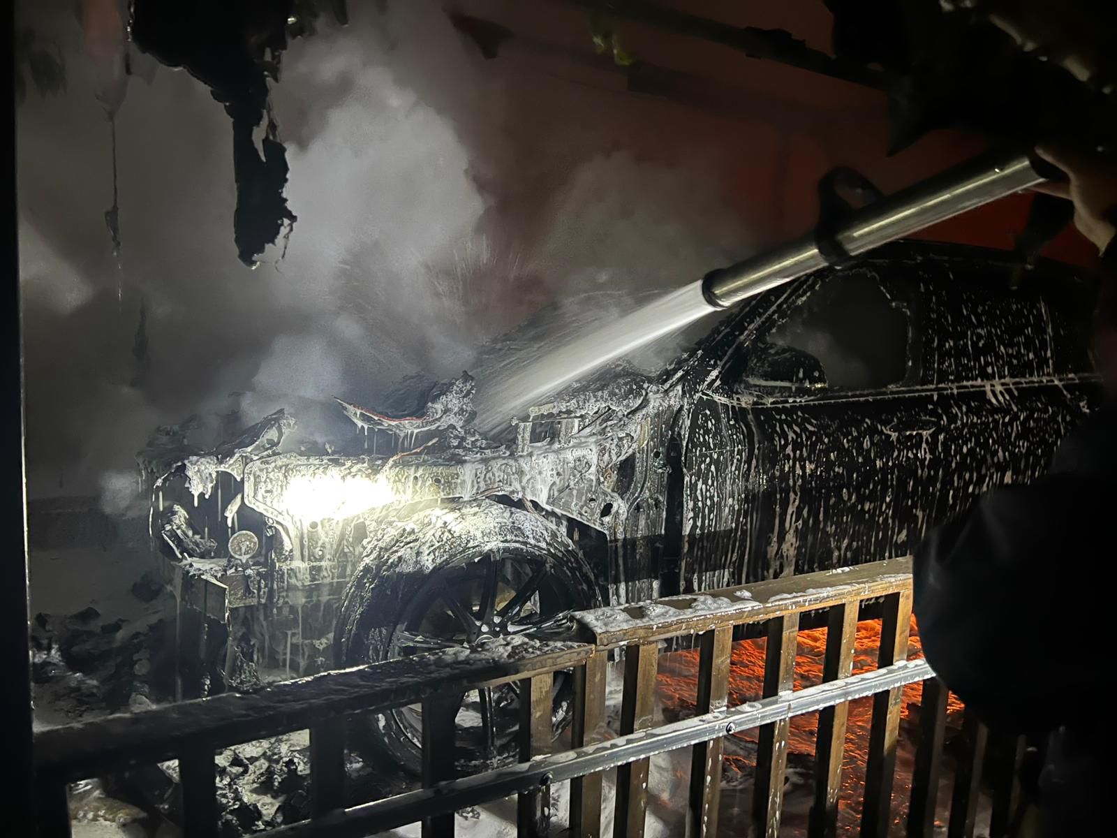 عمل الطاقم على إخماد النيران في المركبة وحصرها إضافة إلى التبريد على النيران وتفقد المركبة ومحيطها .