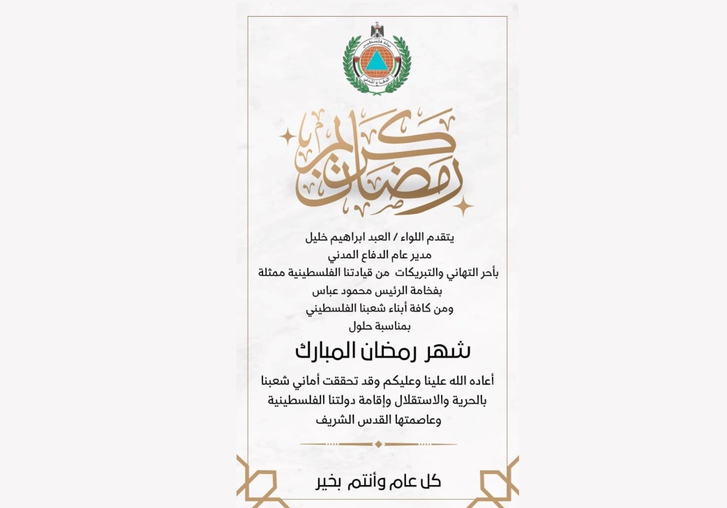 أبرق مدير عام الدفاع المدني اللواء العبد إبراهيم خليل تهنئة بحلول شهر رمضان المبارك لطواقمنا... المزيد