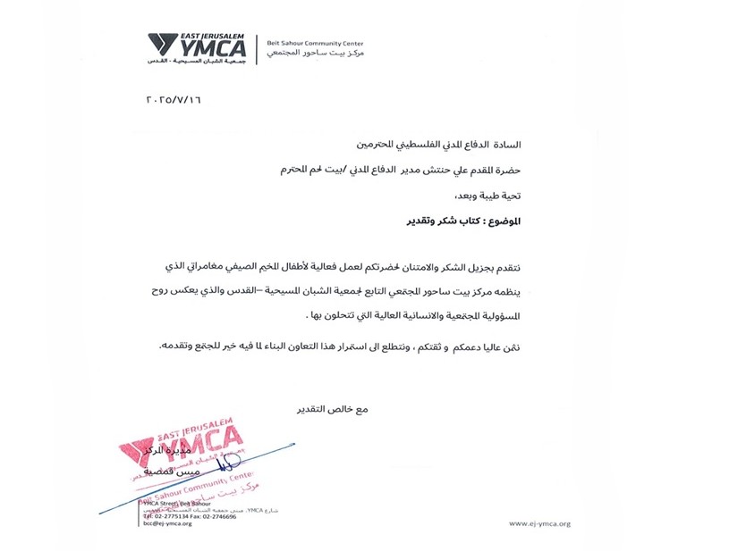 برقية شكر وتقدير لطواقمنا في محافظة بيت لحم