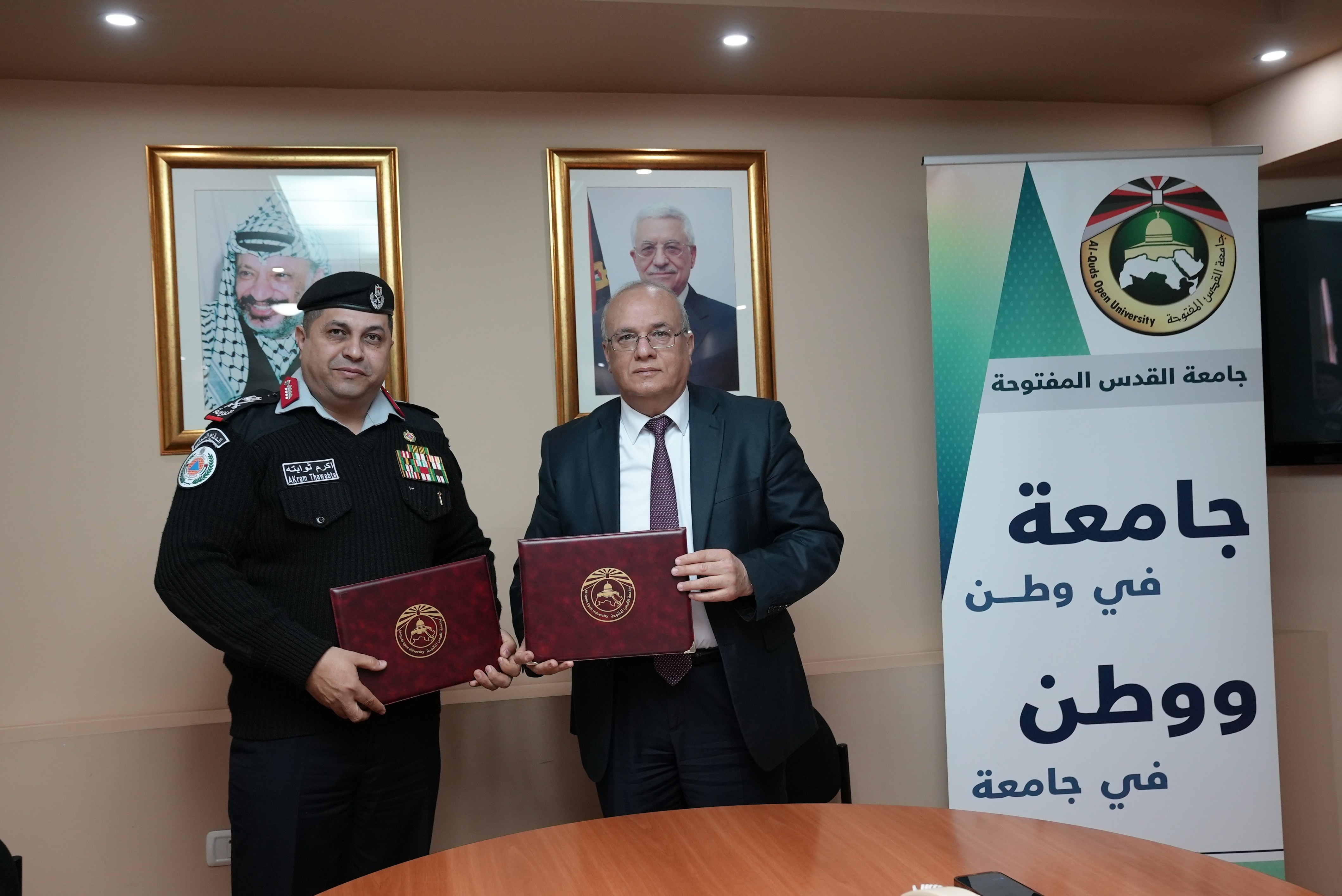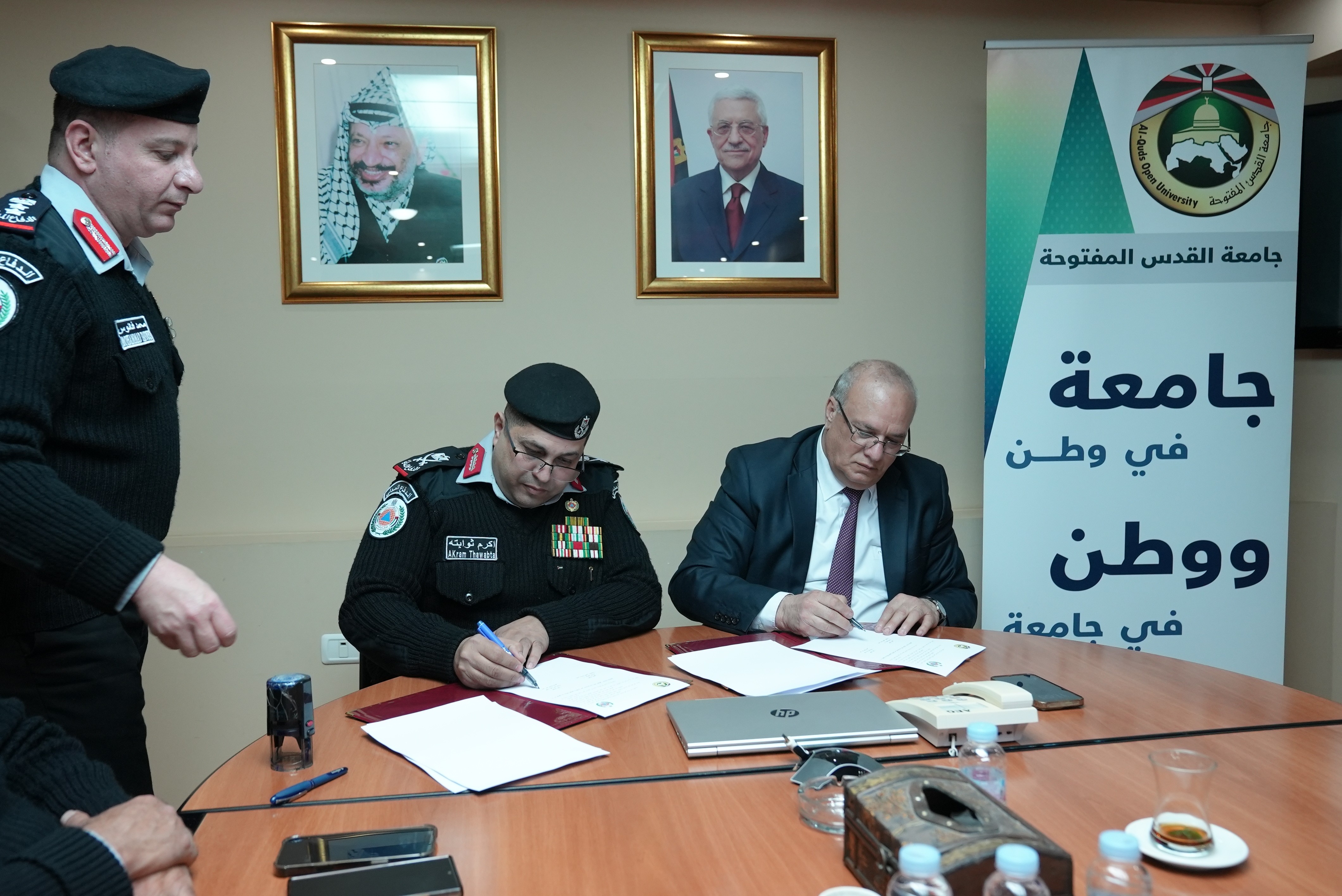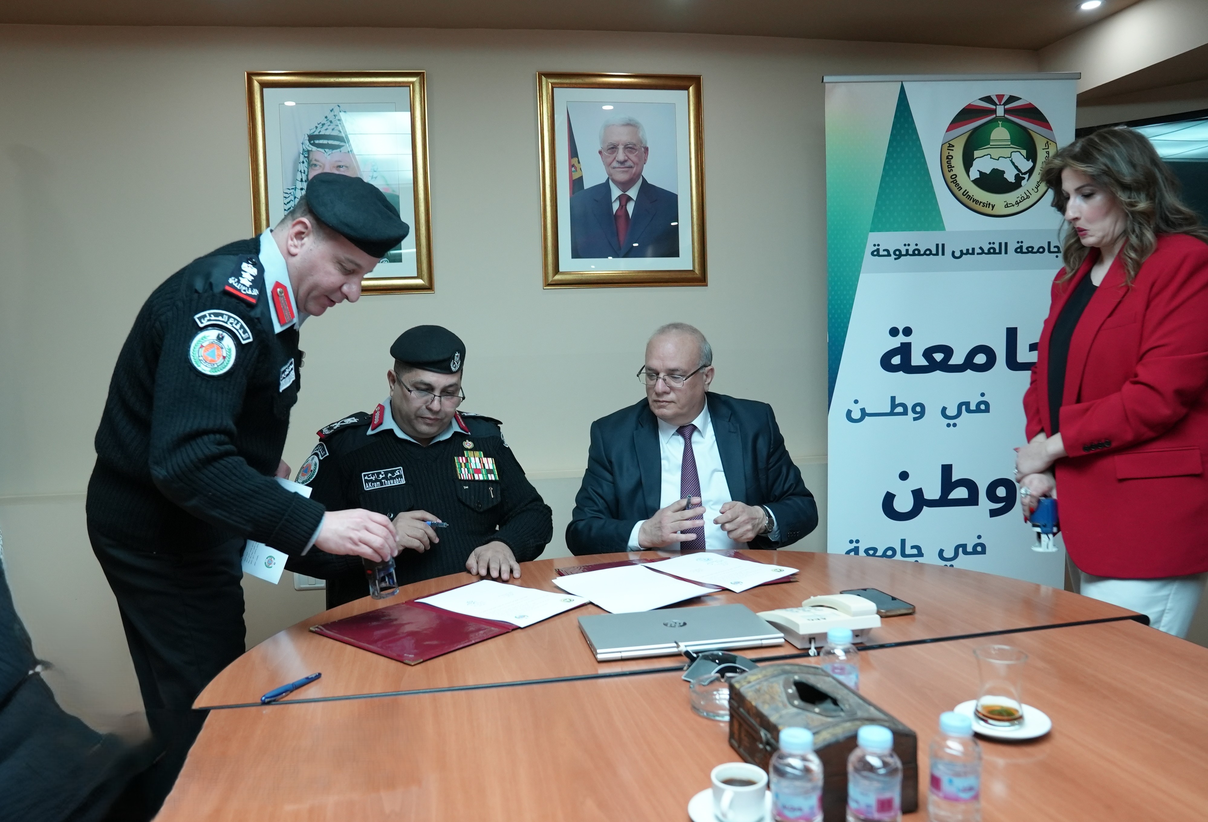 وقّع الاتفاقية عن الدفاع المدني المدير العام اللواء ركن أكرم ثوابتة والجامعة رئيسها أ. د. إبراهيم الشاعر، وذلك في مقر رئاسة الجامعة برام الله والبيرة ، بحضور عدد من المسؤولين وممثلي الجانبين .