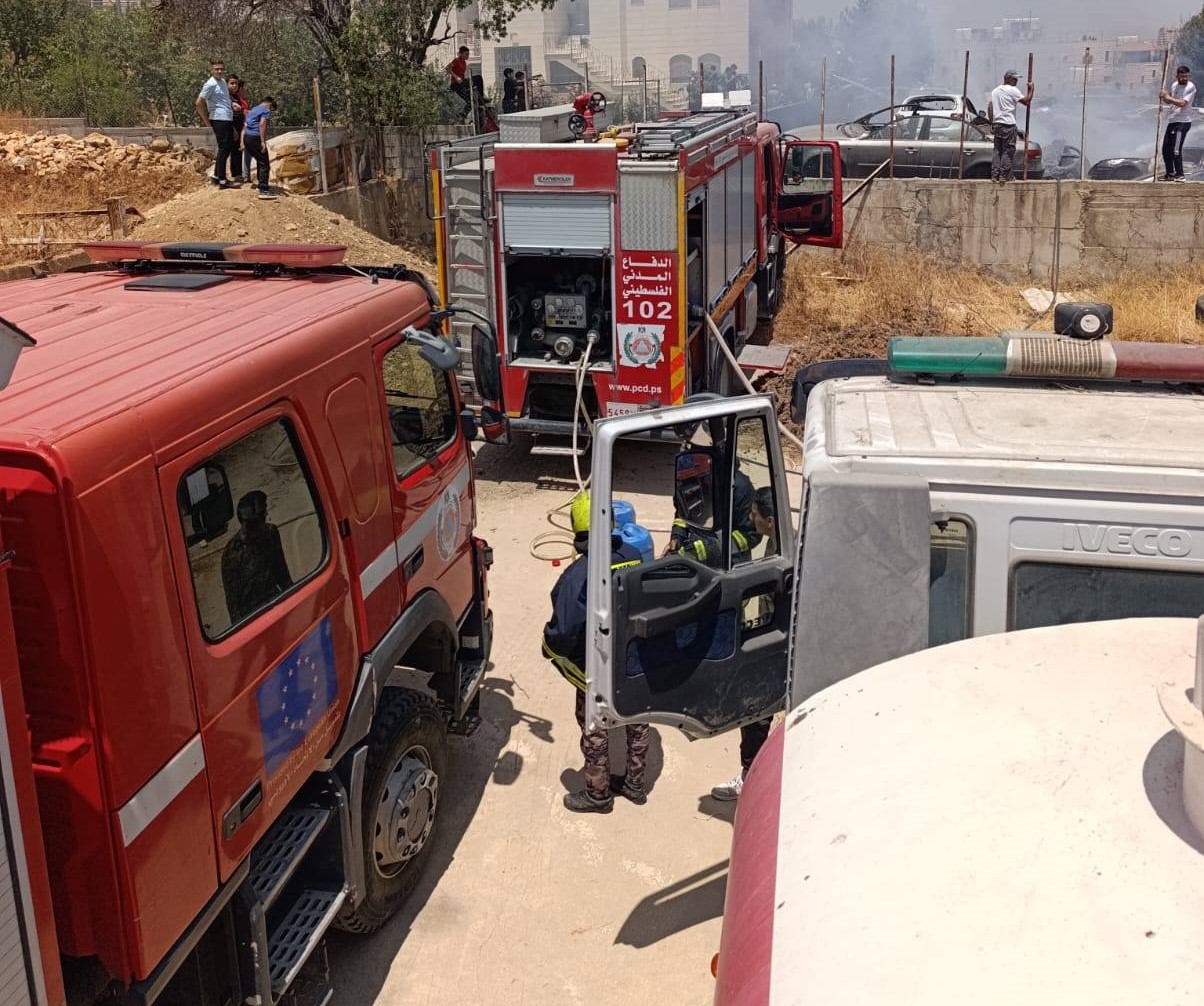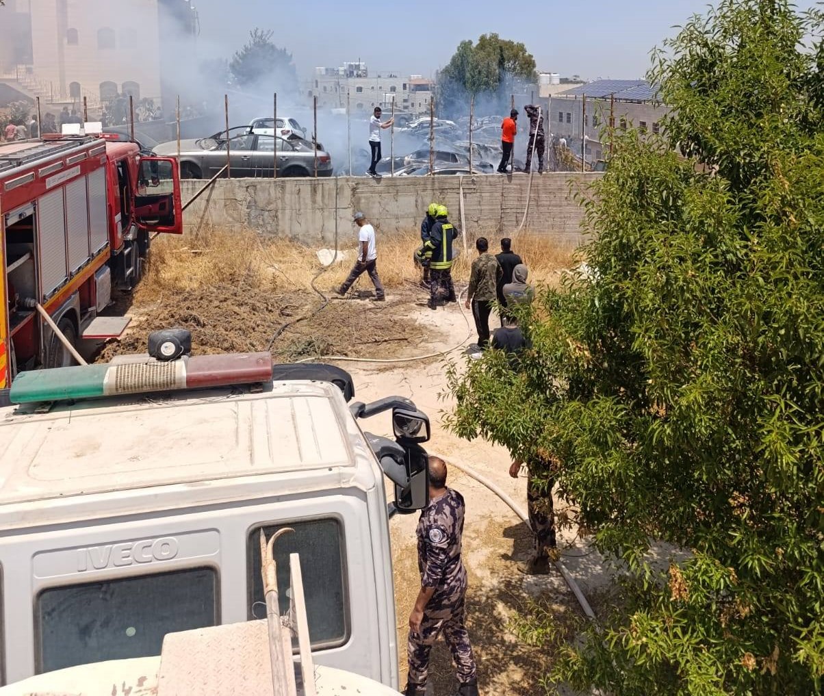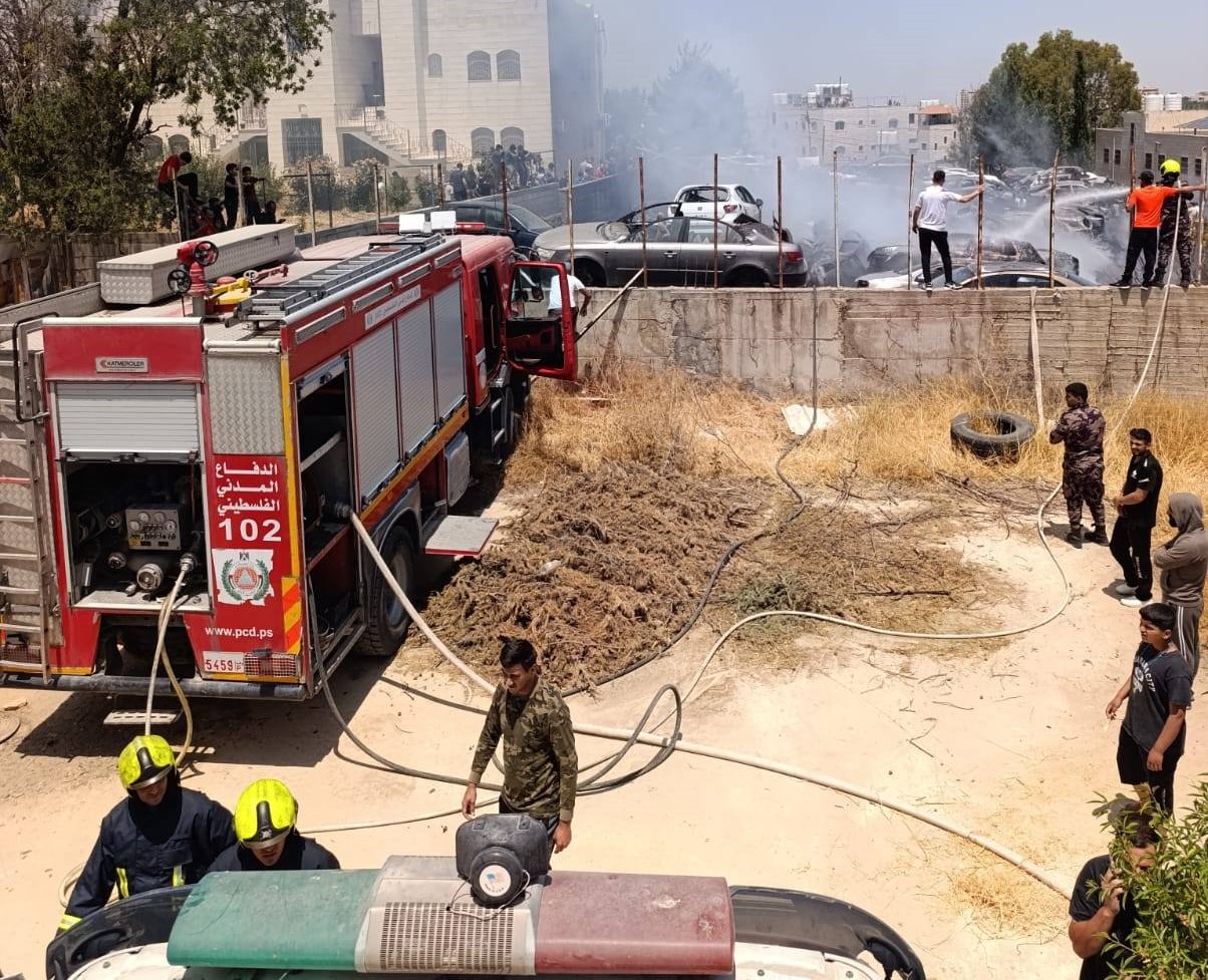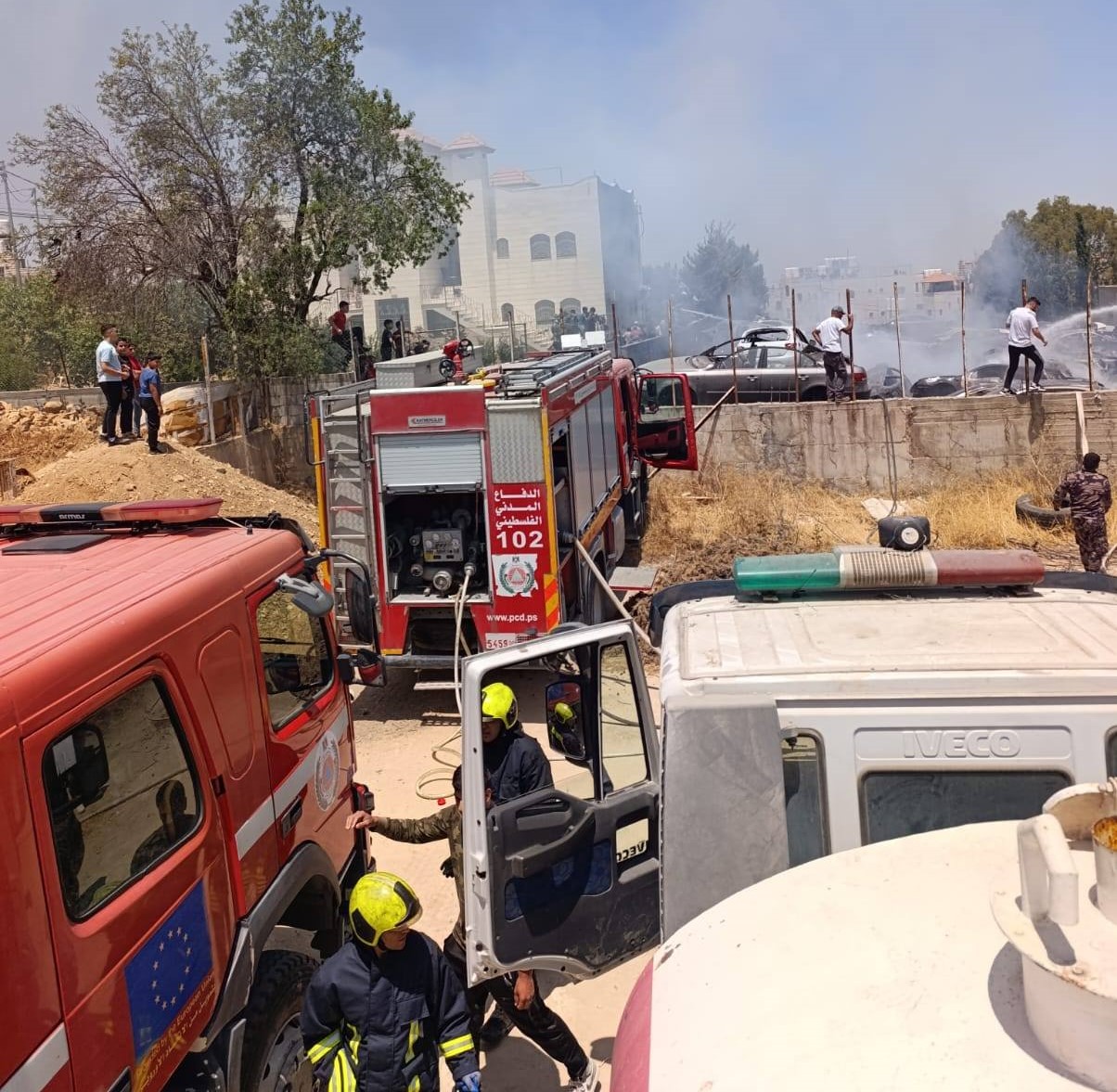 قامت طواقمنا من وحدة دعم وإسناد الجنوب ومراكز بيت أولا ودورا ومساندة الأهالي وطواقم بلدية حلحول بإخماد النيران التي نشبت بإحدى مشاطب المركبات ، فإندلعت وطالت النيران عدد من المركبات وقطع الغيار للمركبات وممتلكات وأغراض مستعملة وعملت الطواقم بآلياتها وطواقمها على الحد من إنتشار النيران والحريق ومنع وصولها إلى الممتلكات المجاورة والحد من إتساع مساحتها ومحاصرتها عن طريق التبريد والعزل والتمكن من السيطرة عليها ومنع وصول السنة اللهب الى المركبات وإنقاذ عشرات المركبات الأخرى .