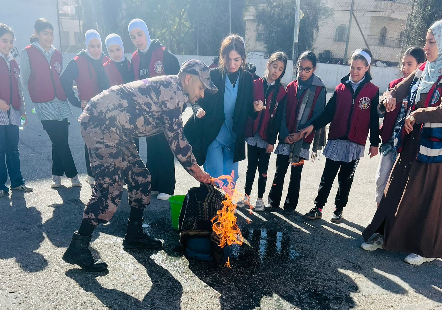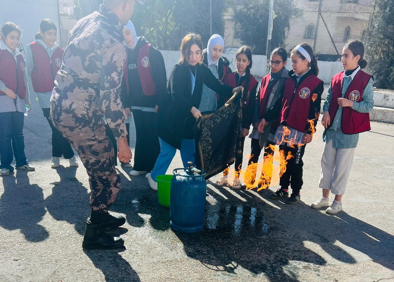 شمل التدريب طرق مواجهة الحرائق واستخدام وسائل السلامة العامة وتدريبهم وتعريفهم على اسطوانات الإطفاء اليدوية ومخاطر الغاز المنزلي والكهرباء والمدافئ ومخاطر فصل الشتاء وكيفية التعامل السليم معها ، إضافة لطبيعة عمل رجل الدفاع المدني ومهامه والحديث عن علوم الدفاع المدني بكافة جوانبه ، وإطلاعهم على مركبة الإطفاء ومحتواها والمعدات وآلية عملها والتعامل مع الإصابات وحوادث السير ، ولباس رجل الإطفاء .