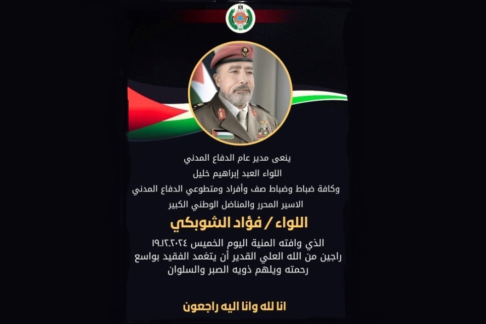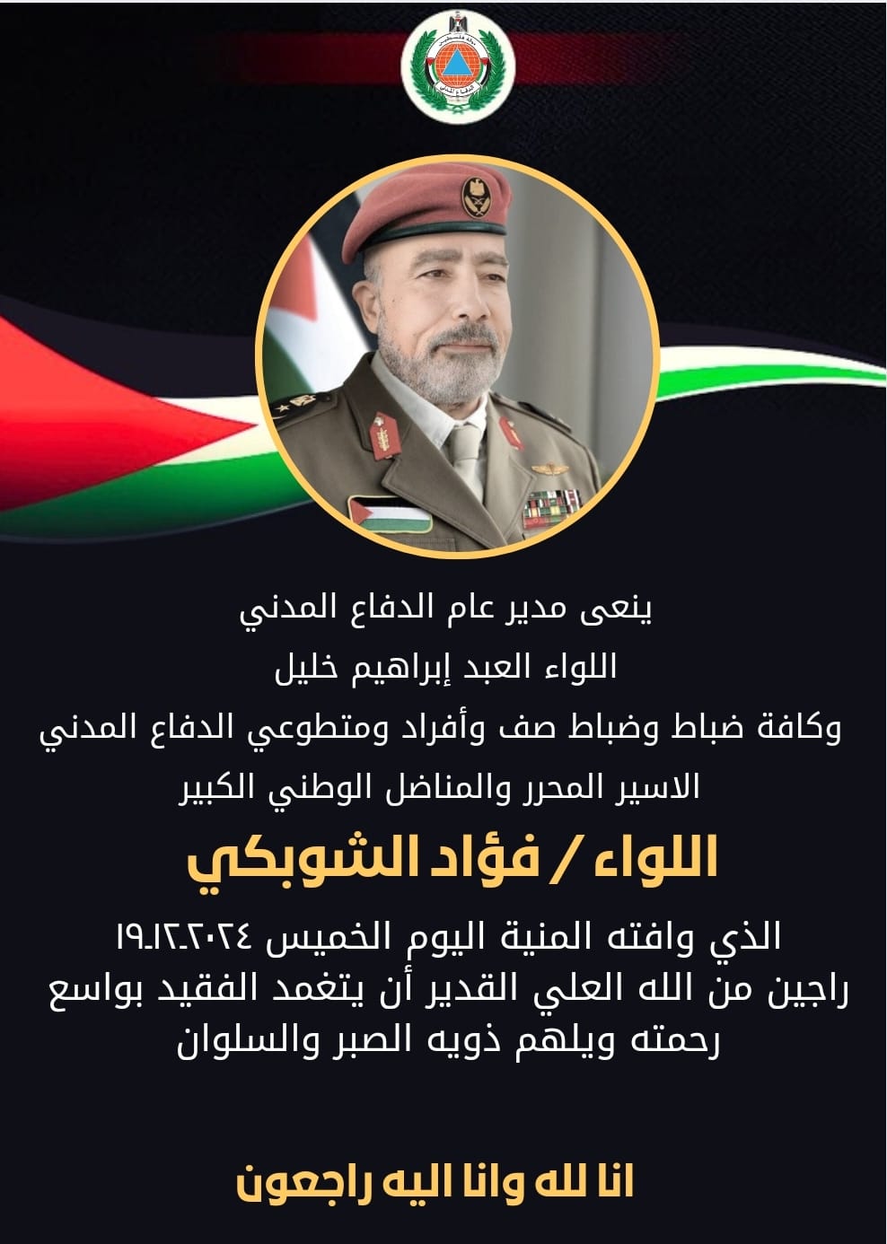 مدير عام الدفاع المدني اللواء العبد إبراهيم خليل وكافة كوادر الدفاع المدني الفلسطيني يتقدمون بأحرّ التعازي والمواساة من