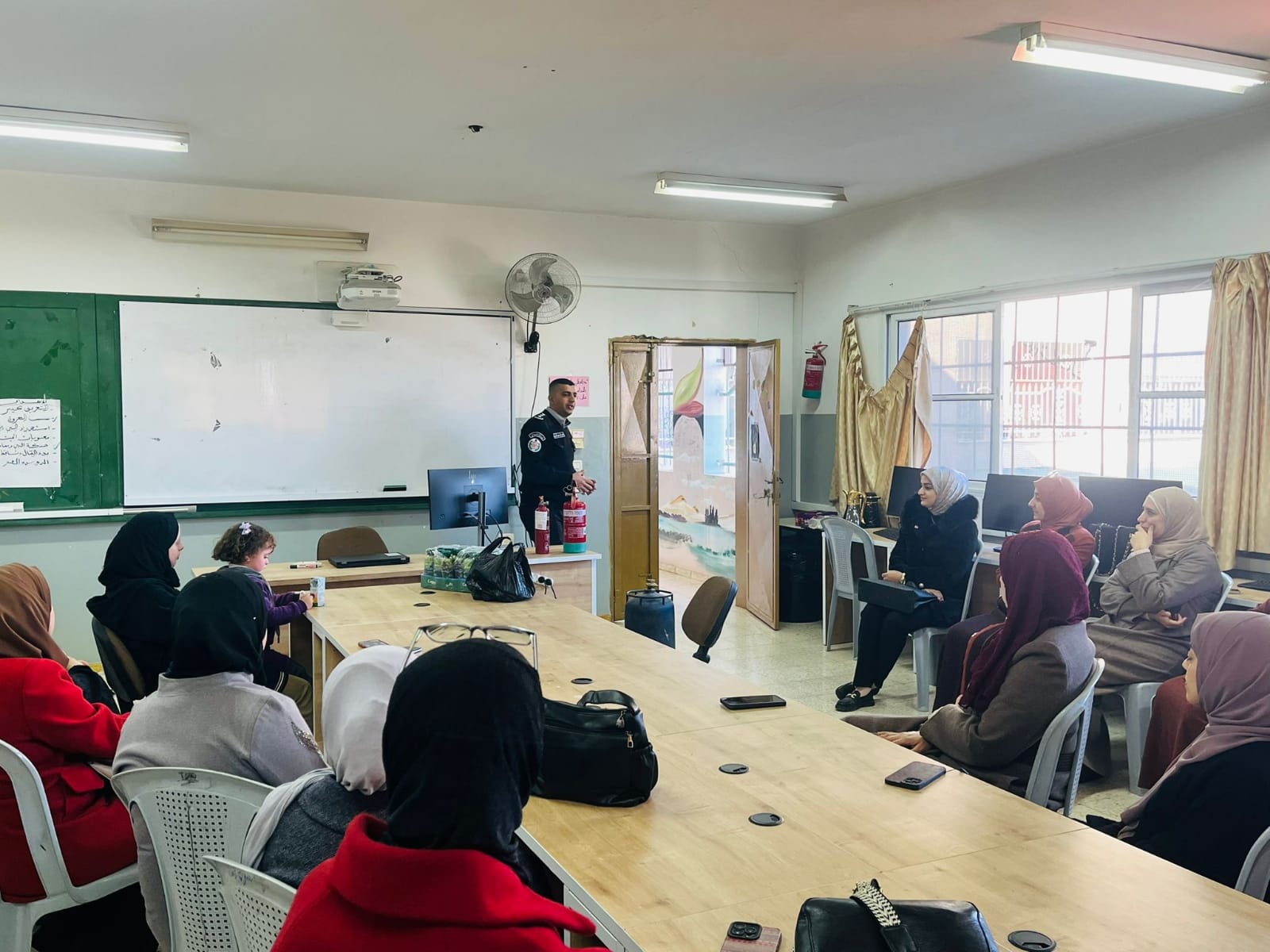 ضم التدريب طالبات المدرسة إضافة للهيات التدريسية وشملت المحاضرات الجوانب النظرية لعلوم الدفاع المدني وما يرافقها من إطفاء وإنقاذ وإخلاء ووقاية والسلامة المنزلية والتصرف السليم والسلوك الصحيح عند التعامل مع الكوارث الطبيعية وتم تعريفهن على مركبة الإطفاء ومحتواها من معدات وأدوات ومعرفة طبيعة عمل كل معدة ، وتعريفهن بلباس رجل الإطفاء والإطلاع والتدريب على اسطوانات الإطفاء اليدوية ومخاطر الغاز المنزلي والكهرباء وكيفية التعامل السليم معها ، وطبيعة عمل رجل الدفاع المدني ومهامه بمكافحة الحرائق وإنقاذ المواطنين باستخدام المعدات المخصصة وإرشادهن لوقاية أنفسهن من مخاطر الحرائق والحوادث .