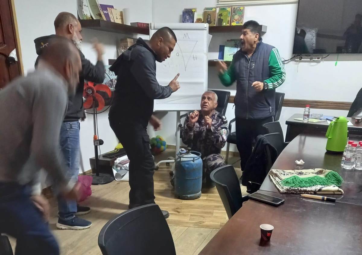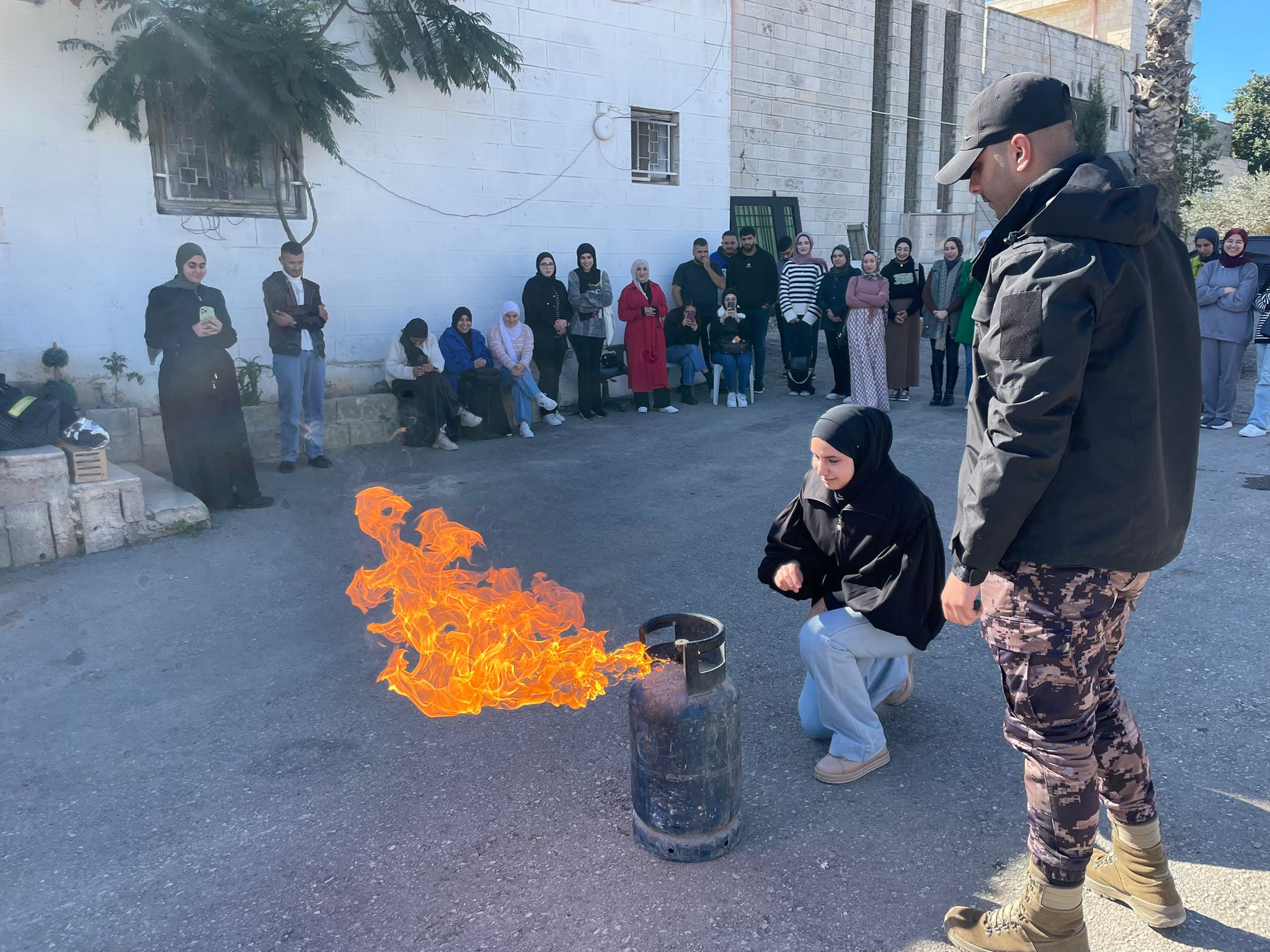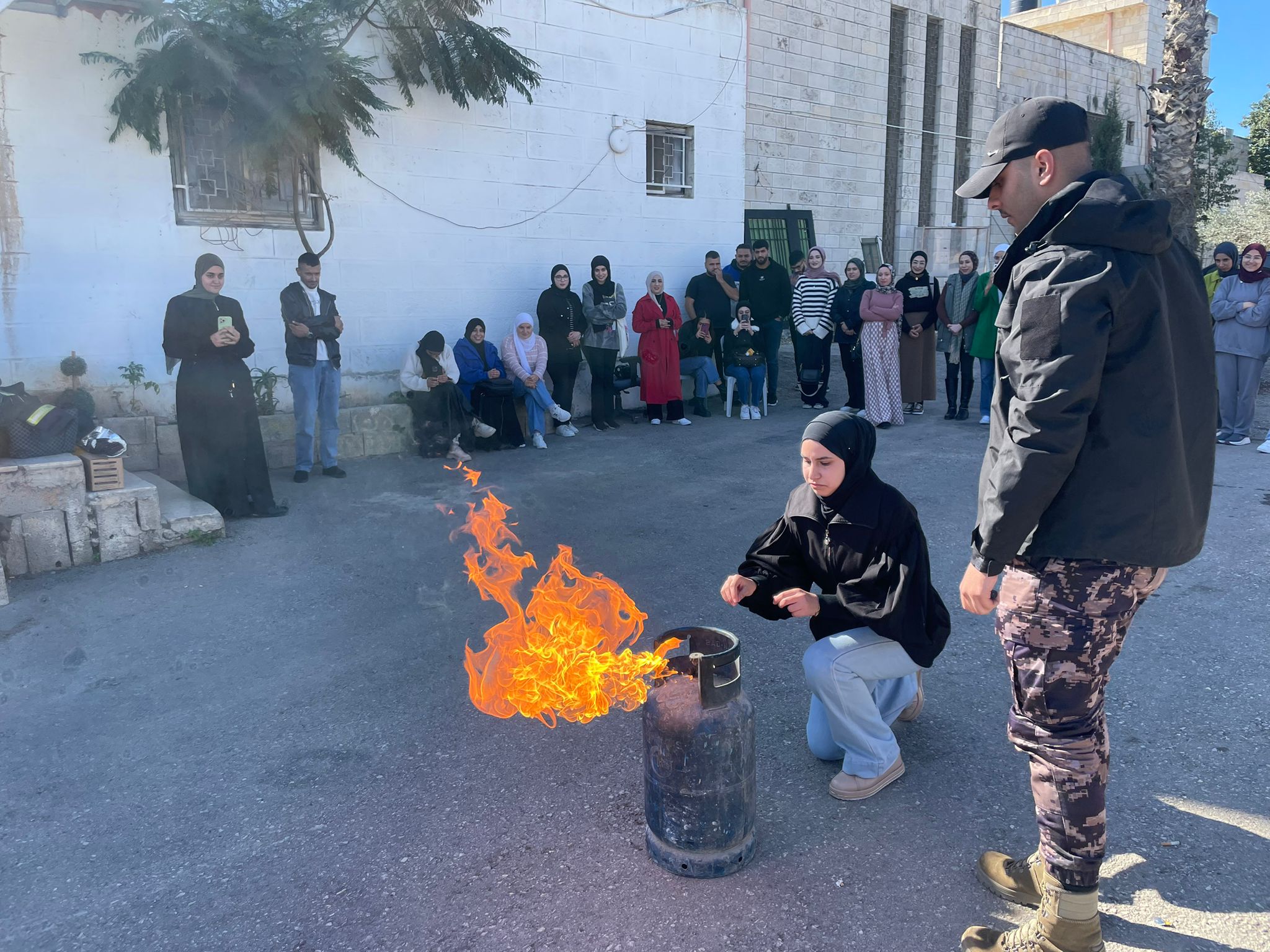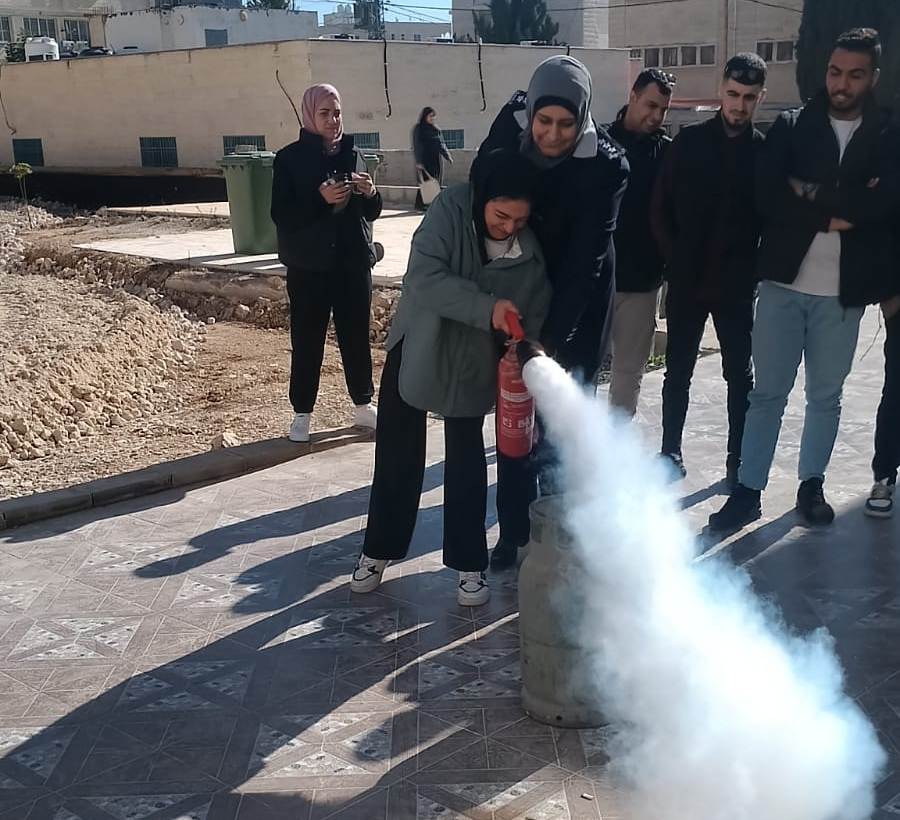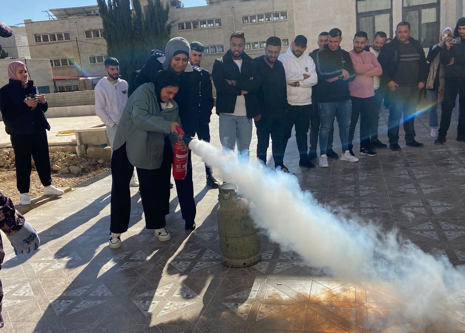 كما تم التدرب على إستخدام مطفأة الحريق اليدوية وإخماد الحرائق بها وإخماد حريق إسطوانات الغاز المنزلي إضافة لتطبيق قواعد الإنقاذ والإسعاف الأولي والتصرف الصحيح والسليم عند حدوث قصف أو هزات أرضية وما بعدها .